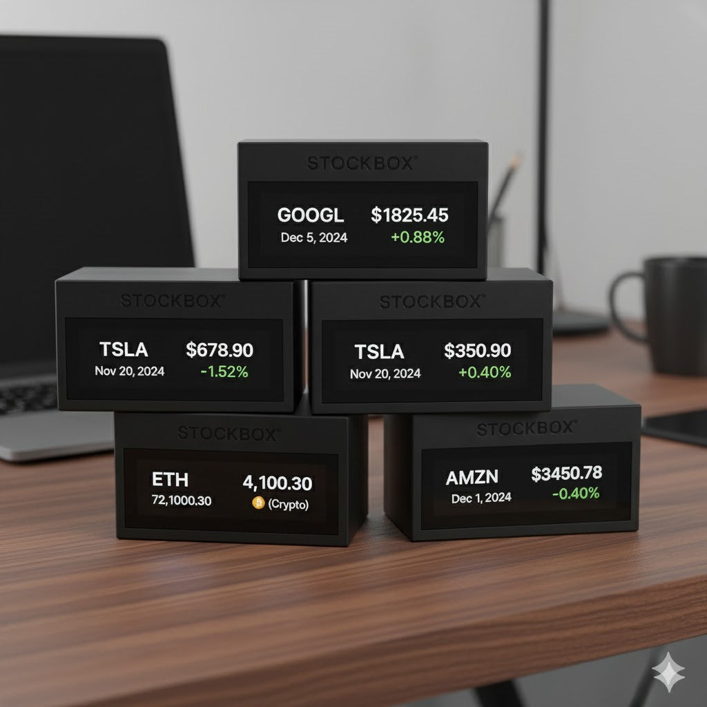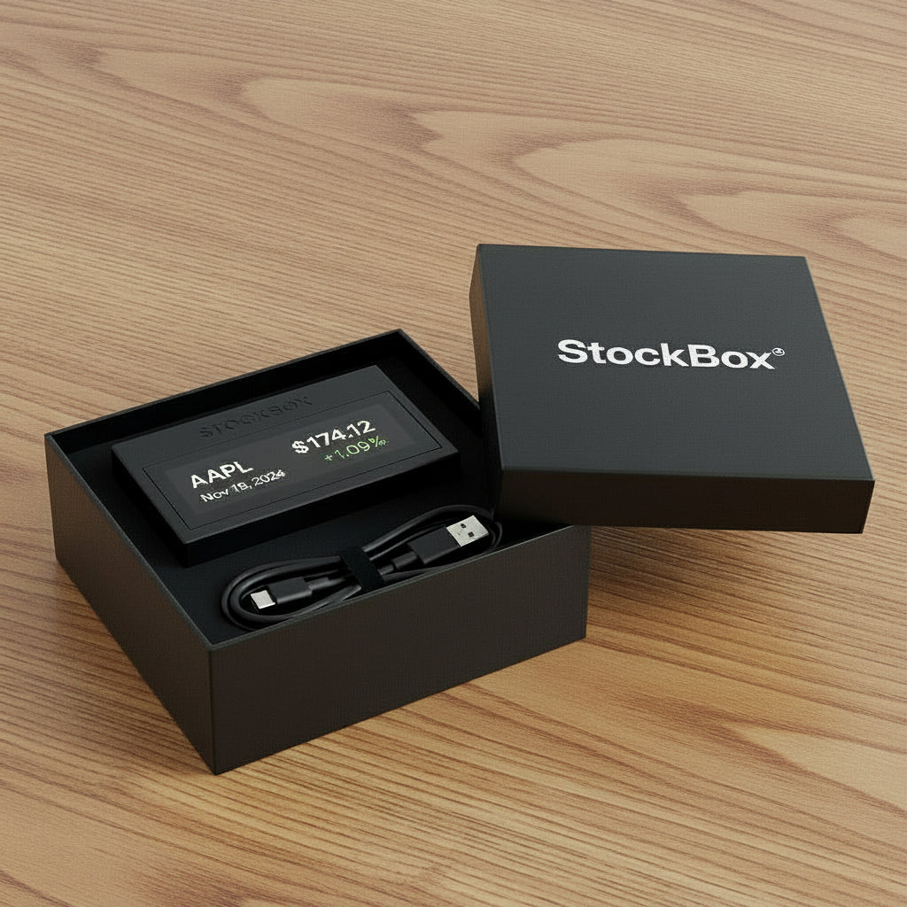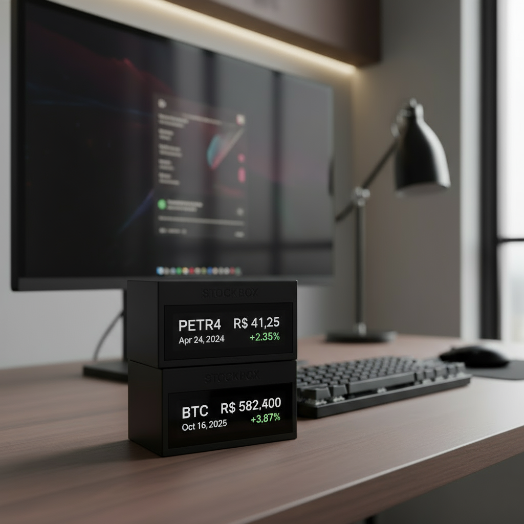 O Stock Box® é um dispositivo que exibe, em tempo real, a cotação e variação das ações, fundos e criptos que você escolher — com um visual moderno que combina tecnologia e elegância.